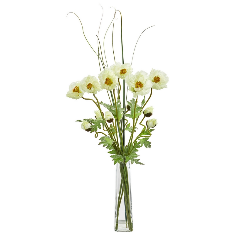 With colorful blooms as the centerpiece, this poppy and grass artificial arrangement also features lifelike leaves on the thin stems and tall grass to accent the beautiful poppy flowers. Coming in a pyramid vase, you could place one on each of your night stands for a bright, unified feel in your master bedroom. Or, arrange one next to the welcome plaque at your customer service desk for a cheerful feel.